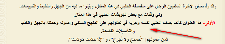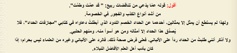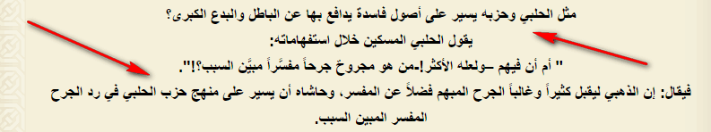 «Подобно Халяби и его секте, который живет и следует порочным основам, защищая ими заблуждения и ложь, великие нововведения!» … «Он не причастен к тому, чтобы следовать пути (манхаджу) халябитской секты …»:
