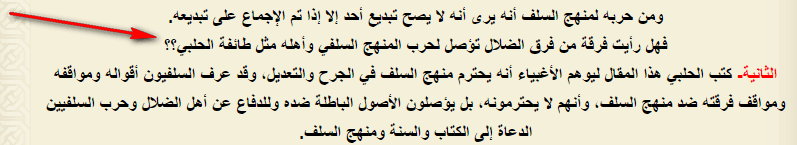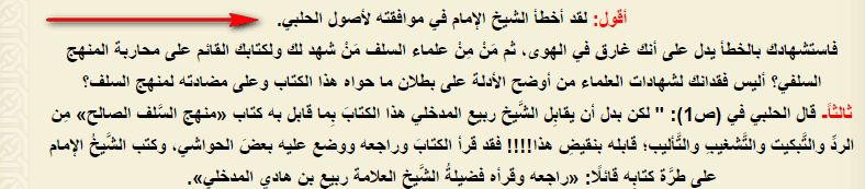 «И эти высказывания мерзкого Халяби, который использовал слова Шейхуль-Исляма, ясно сказанные в адрес крайних мурджиитов, (опустил их на) шейха аль-Бухари подвергнув его позорной ругани. Ведь он посчитал, что слова аль-Бухари являются словами крайних мурджиитов…»: